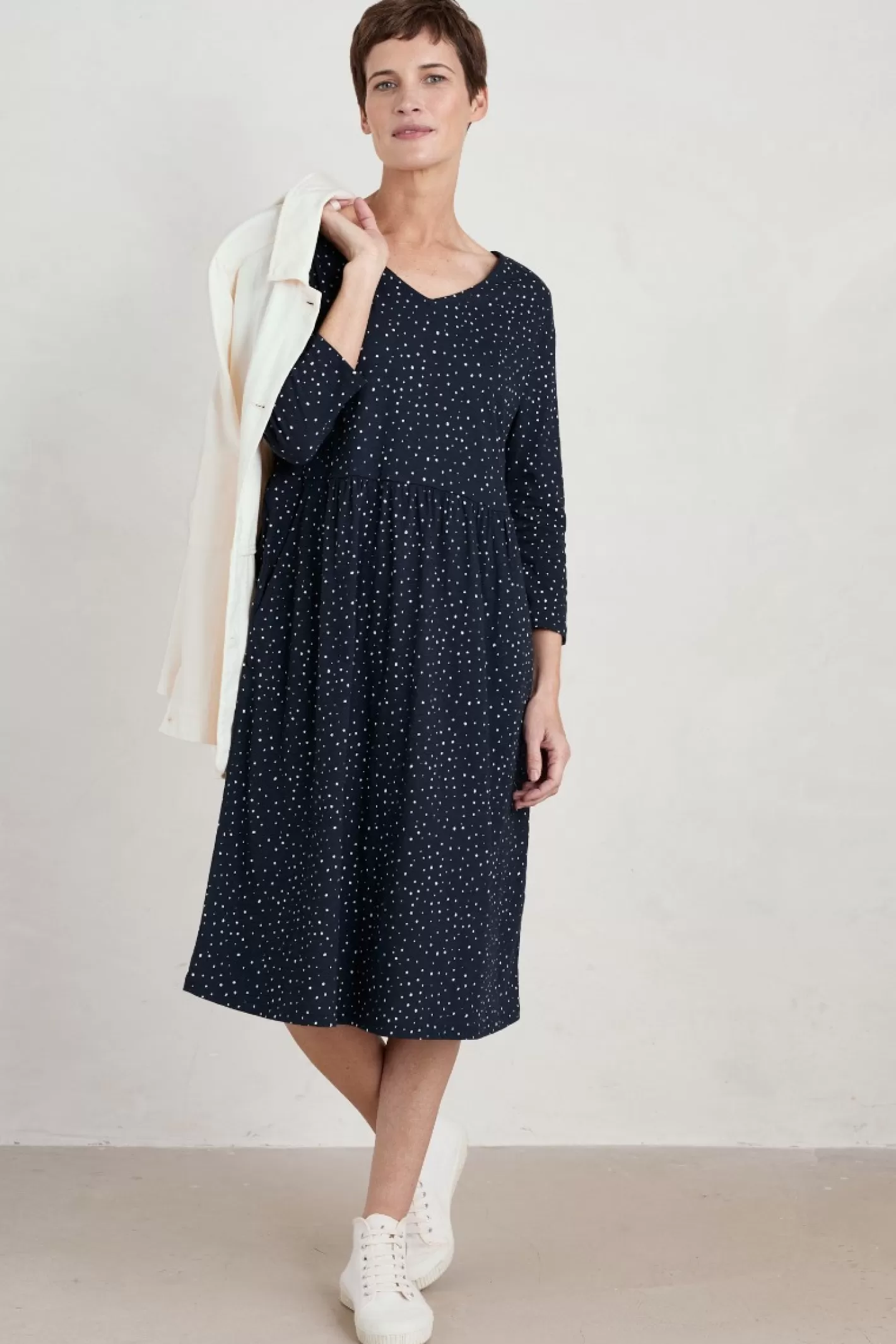 An Effortless Dress In Soft Organic Cotton Jersey, With A V Neck And Softly Gathered Skirt. The Skimming Fit Is Comfortable And Drapey, Perfect With Boots For Winter Walks Or Smart Shoes For Festive Celebrations.